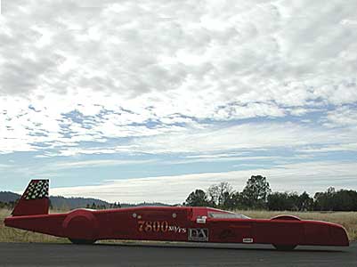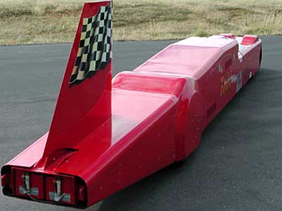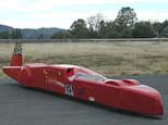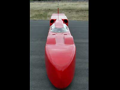This rocket propelled Bonneville broke record speed at 307mph. Dimensions are 26' long, 30" wide, and 60" to the top of the tailfin.